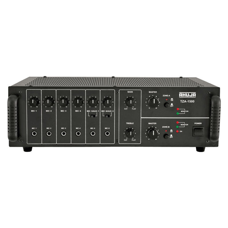 TZA-1500 permits connecting 100V (LMT) type speakers to one Zone and low impedance type speakers to other Zone without causing overloading and overheating. Instant transfer to DC power (Car Battery) if AC fails. Zone On/Off facility. Output levels of each Zone can be set independently to desired levels and the zones can be switched On/Off without disturbing the volume settings.