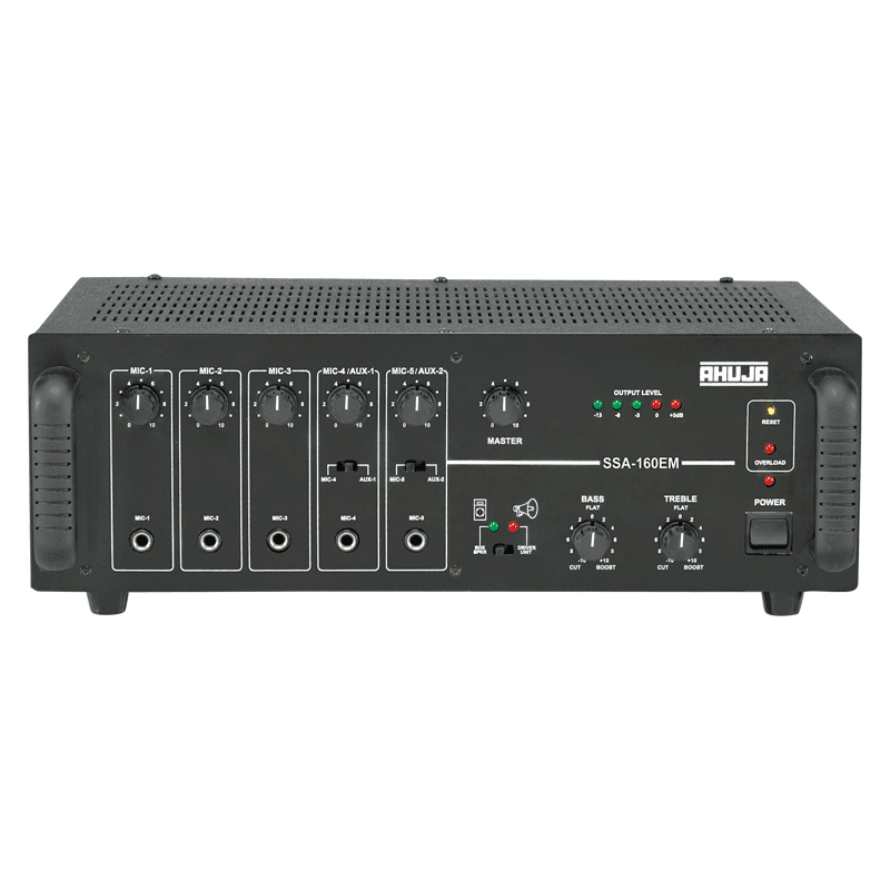 The Ahuja SSA160EM PA Mixer Amplifier gives a Resettable circuit breaker for protection against overload and short circuits. It also has an Instant transfer to DC power (Car Battery) if AC power fails. Features a Box Speaker/Driver Unit selector switch. Bass boost defeated at Driver Unit position for safer operation of driver units.