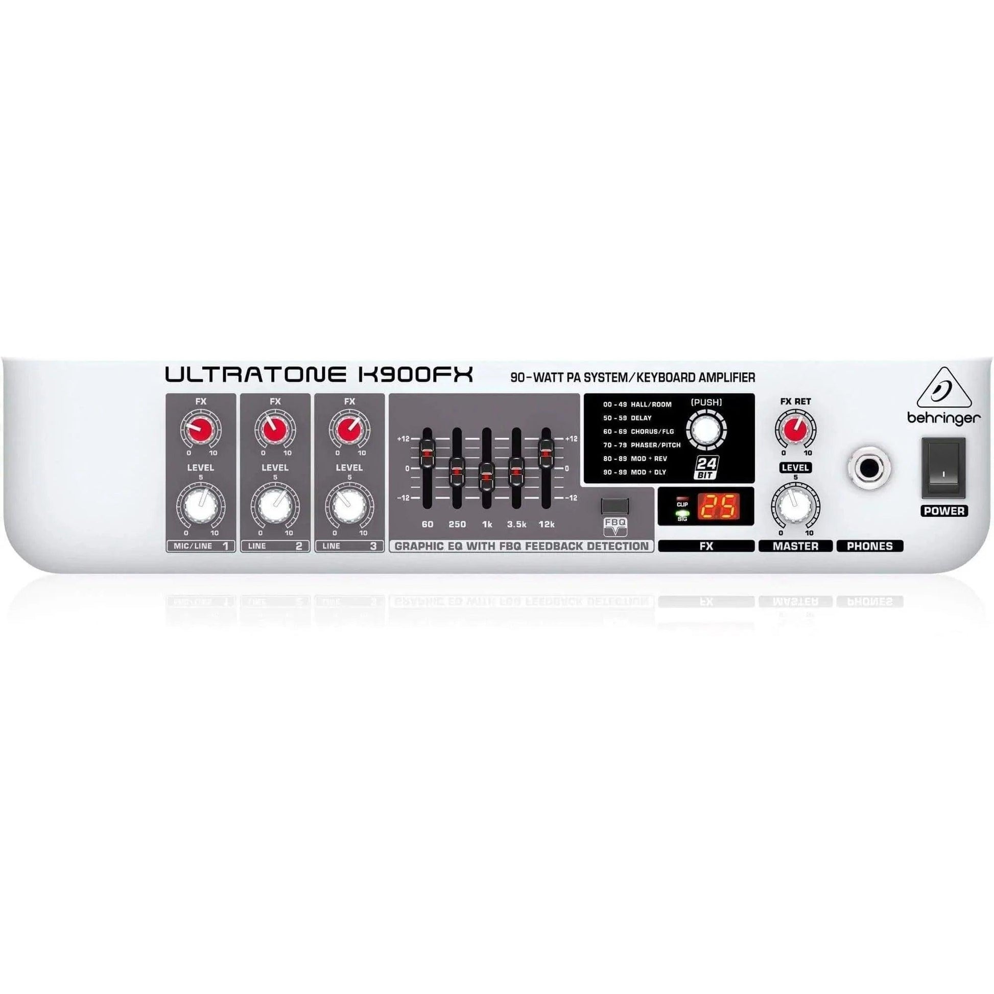 The 90-Watt ULTRATONE K900FX excels as an extraordinarily-versatile keyboard and drum amplifier, as well as a high-quality 3-channel Public Address (PA) system, with a world-class, 12" BUGERA Speaker, all in one compact and easy-to-transport package. Specializing in rich, accurate tone and professional features, such as a studio-grade Multi-FX Processor and our own FBQ Feedback Detection System, this powerful workhorse will bring out the best in your performance gig after gig.