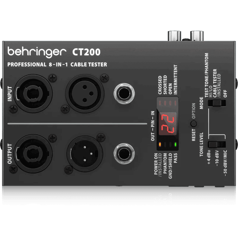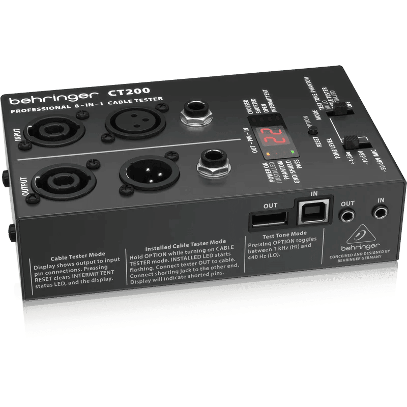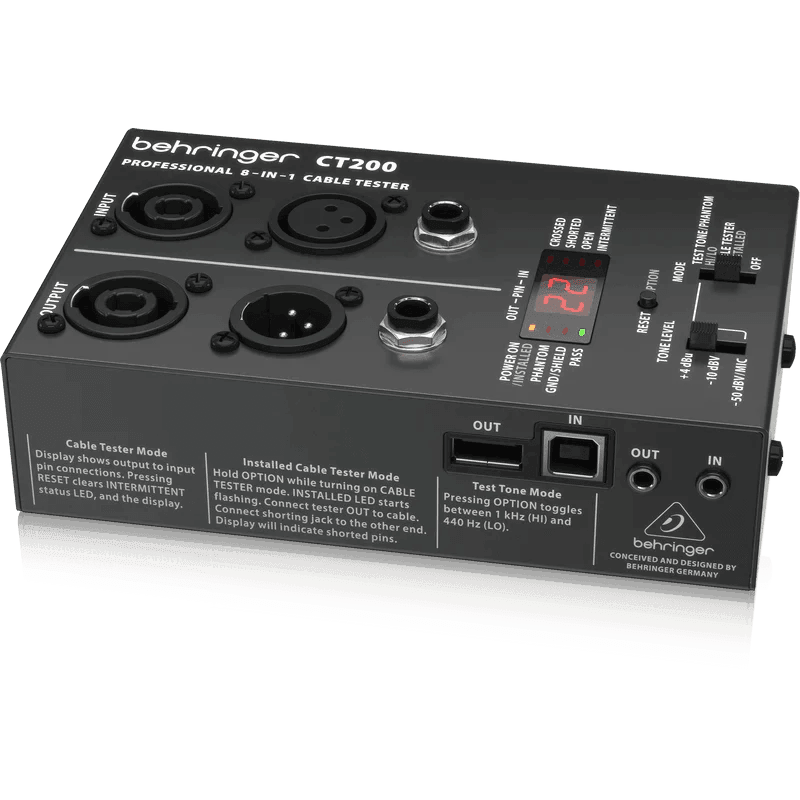 Behringer's CT200 cable tester is an absolute must-have in your studio or live-sound toolbox. This super-affordable 8-in-1 cable tester lets you diagnose common problems in a wide range of cable types. On the audio side, the CT200 lets you check for faults and shorts in cables with XLR, speakON, 1/4" and 1/8" TRS, and RCA connectors. Our techs also appreciate the way it lets you quickly sort out issues with RJ45 Ethernet cables, MIDI cables, and USB cables. What's more, it even works on installed cables, and an onboard test tone lets you quickly check if the signal is passing through clearly.