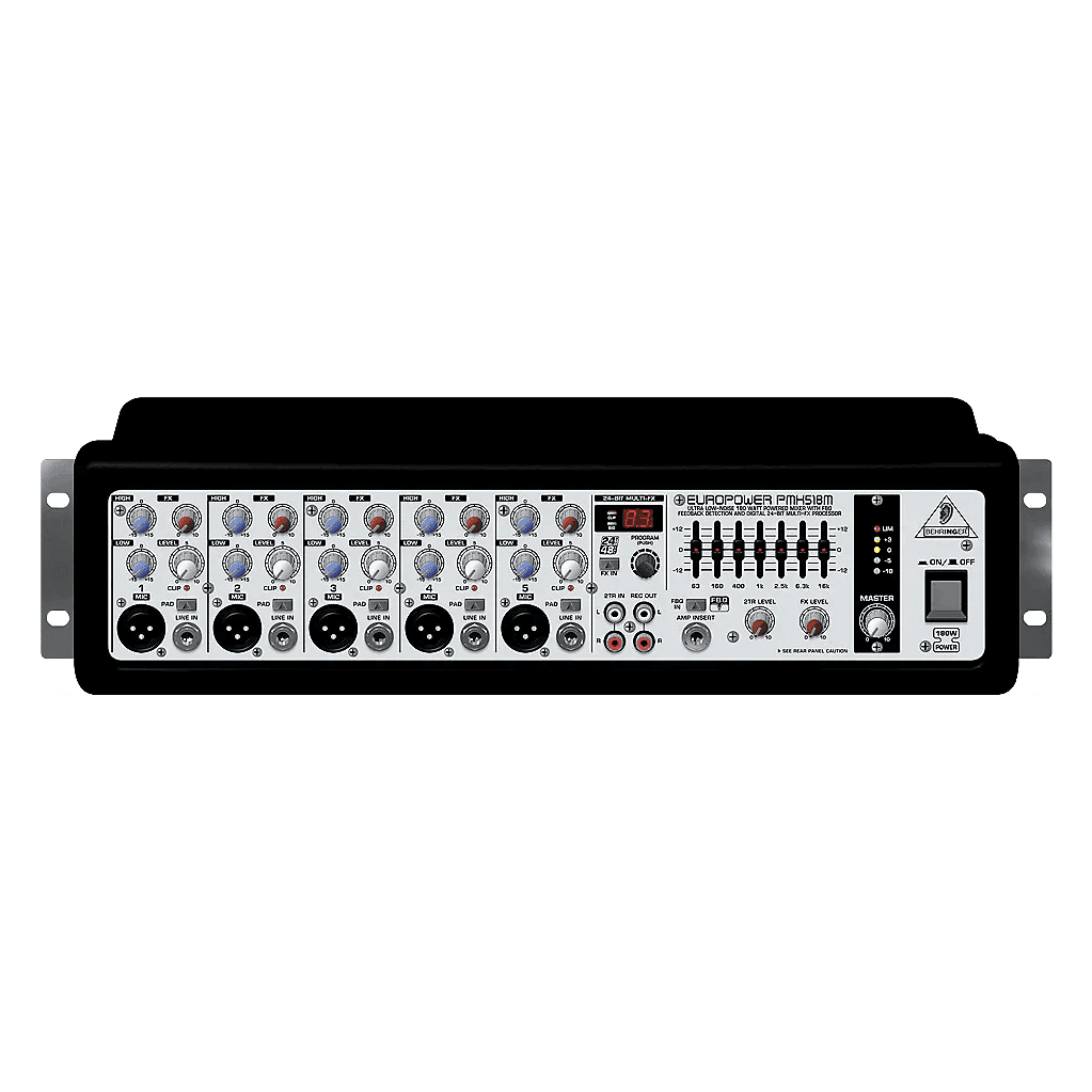 The super-compact, rack-mountable PMH518M 180W 5-channel powered mixer has been equipped with a 24-bit multi-FX processor and FBQ feedback detection system for unsurpassed versatility and capability. Behringer's revolutionary amplifier technology combines enormous power, incredible sonic performance, and super-lightweight in one tight package. PMH518M mixer's dimensions, at nearly half the depth and weight of conventional powered mixers, means no more lugging around dead weight.