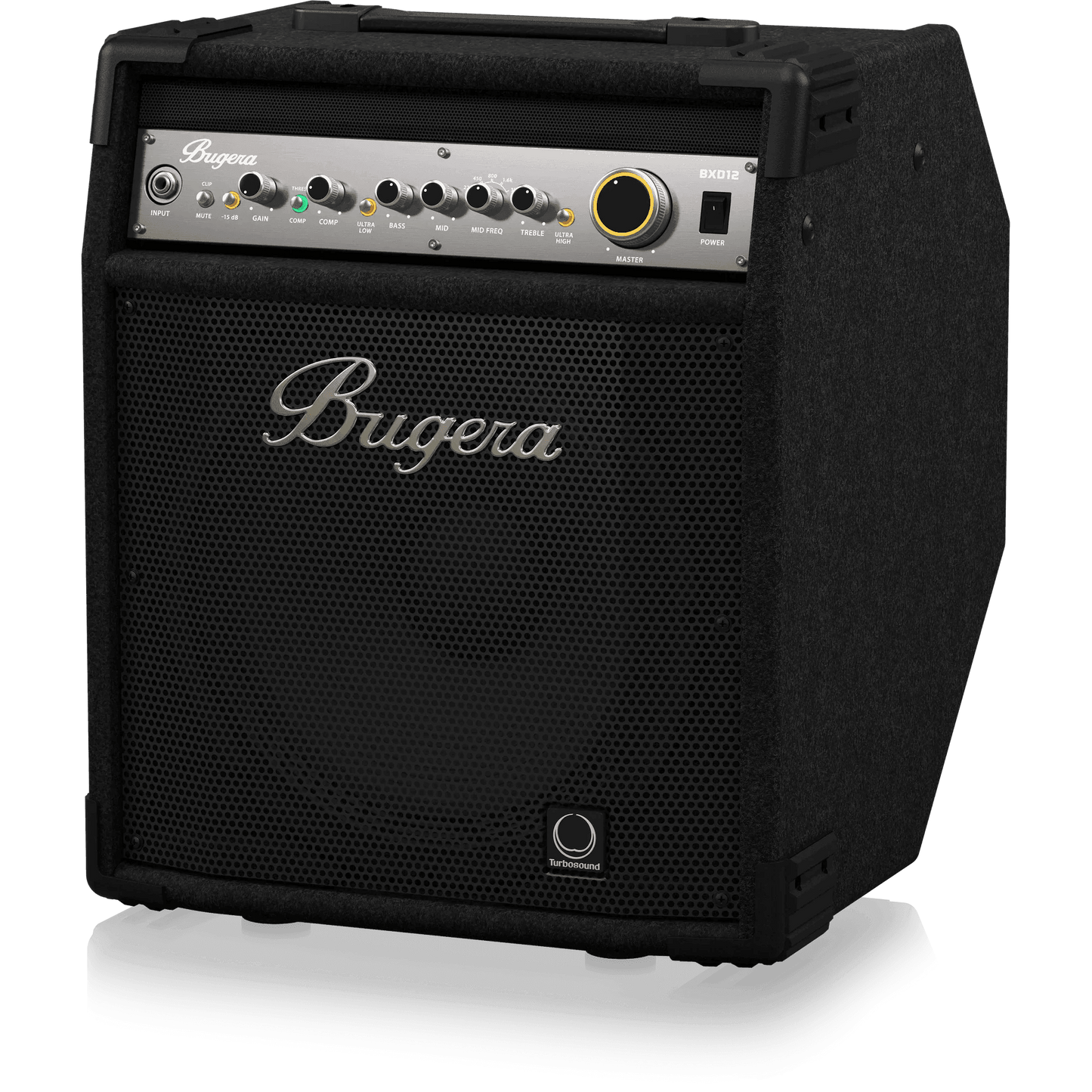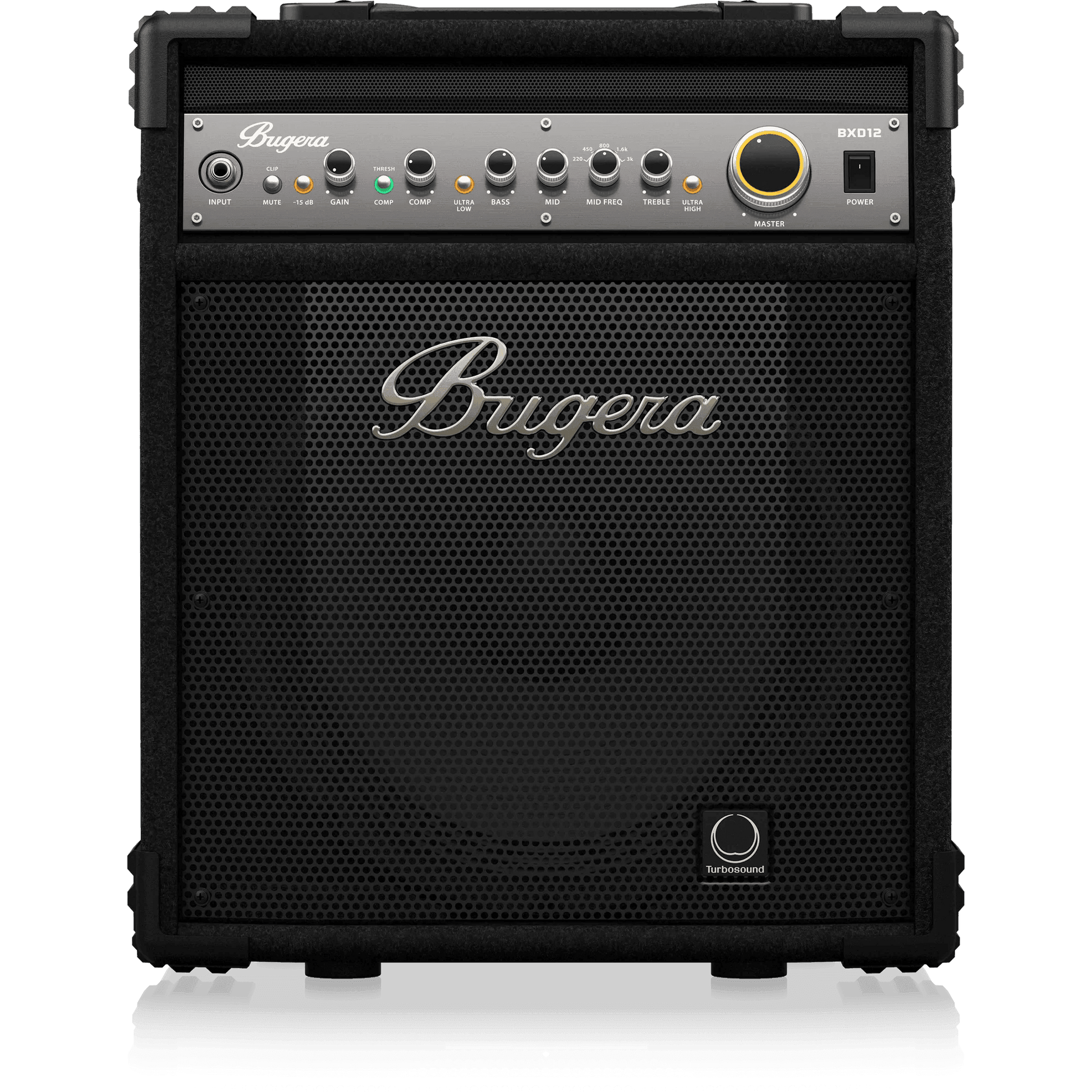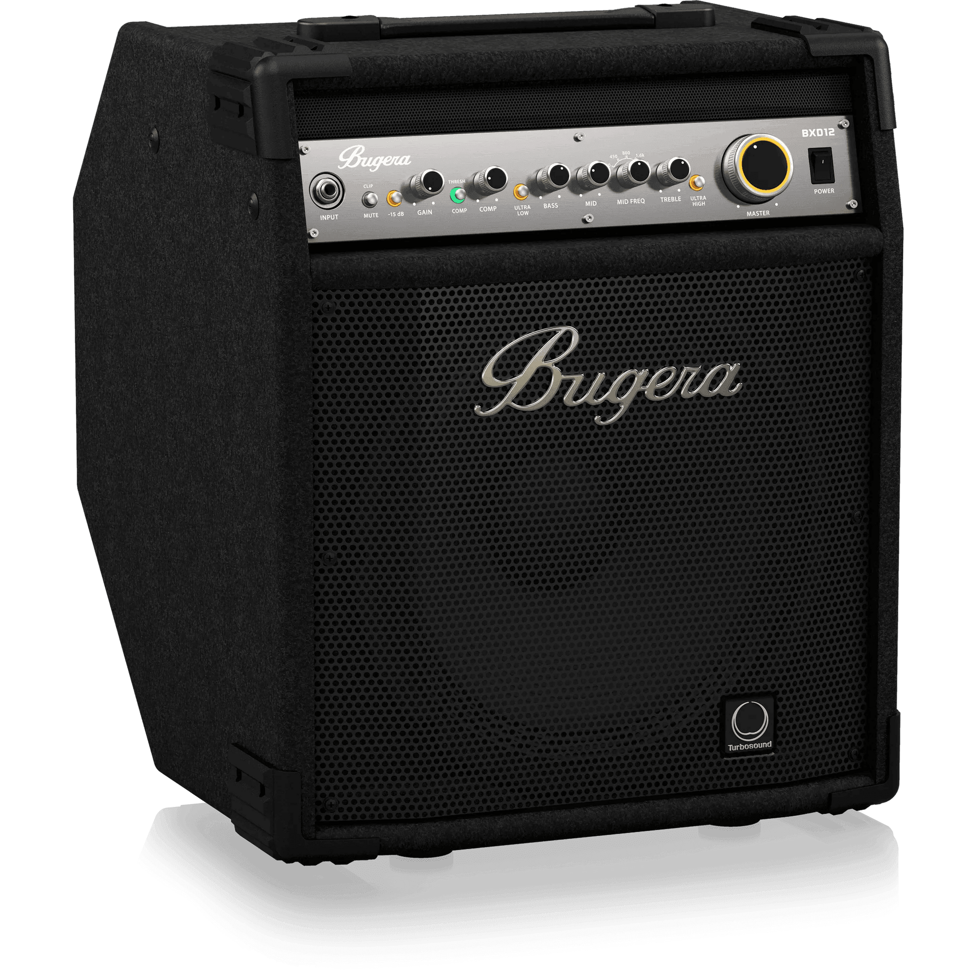 The BXD12 from Bugera is a fully stage-ready powerhouse, delivering an incredible 1,000 Watts through a world-class, British-engineered 12" Turbosound driver that produces an amazingly clear and punchy attack. Offering superb signal shaping via a high-voltage MOSFET preamp with a wealth of bottom, mid and top-end EQ options, a classic compressor and our amazing DYNAMIZER Technology – the BXD12 out punches the competition with ease, style and tone. All these amazing features are lovingly packaged in highly portable, tilt-back enclosure that makes the BXD12 the ultimate player-friendly, onstage tone-machine.